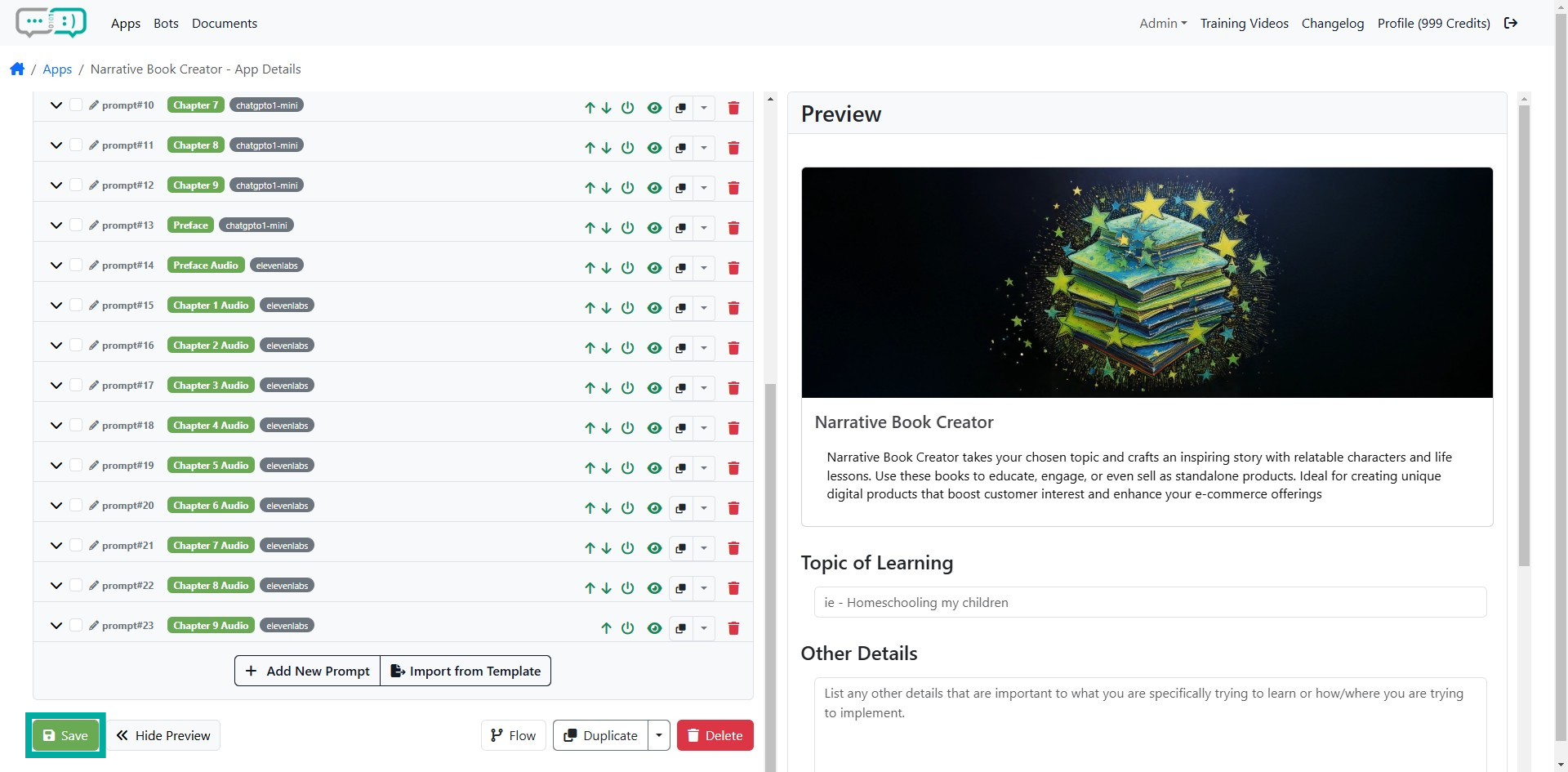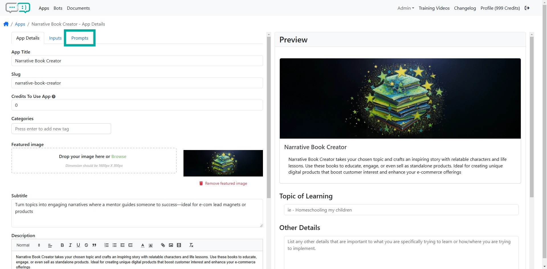 Click the 'Prompts' tab in the App Details to access the prompts section of the app.